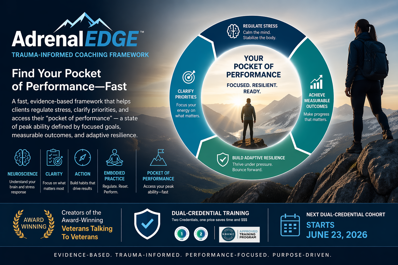 AdrenalEdge™ is a trauma-informed, evidence-based coaching and education series designed for use with clients in high-stress environments where time is limited and performance matters. Built for quick coaching sessions, the framework equips coaches to quickly help clients regulate stress, clarify priorities, and enter their “pocket of performance”—a state of peak ability defined by focused goals, measurable outcomes, and adaptive resilience. By integrating neuroscience, habit design, mythic insight, and embodied practice, AdrenalEdge™ enables meaningful progress in short, high-impact sessions—making it ideal for first responders, leaders, and professionals operating under sustained pressure.